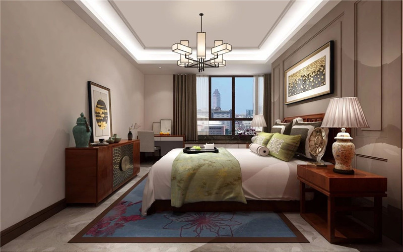 含蓄秀美的现代高贵中式风格,以现代的审美打造富有传统韵味的空间,采用对称式的空间布局,利用不同材质的纹理丰富视觉,富有东方山水韵味的山水画背景,格调高雅,简朴优美。空间以米色为基调烘托出和谐宁静的氛围,再以不同纹理、色彩及物料划分空间,将东方艺术涵蕴从色调的深浅中呈现出来。