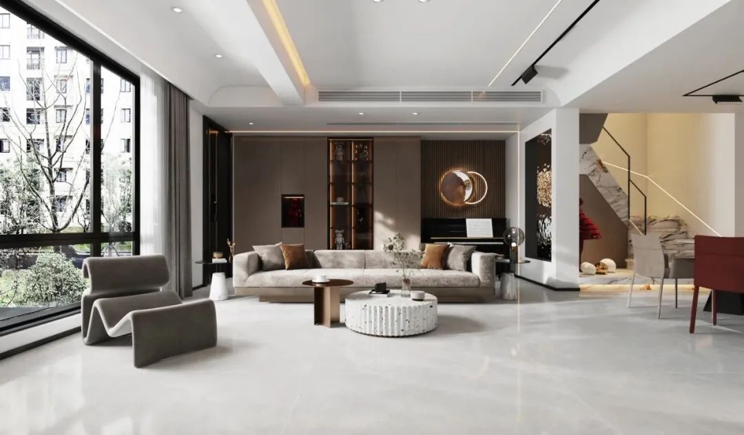 浅灰色调的砖面刻录了春日晨光,柔和而平静,看似单调,实则丰富,光线折射在砖面上似初阳般治愈,演绎空间极致的生命力,同时弥漫着一种静态的和谐美感,营造精致柔和的空间氛围。
