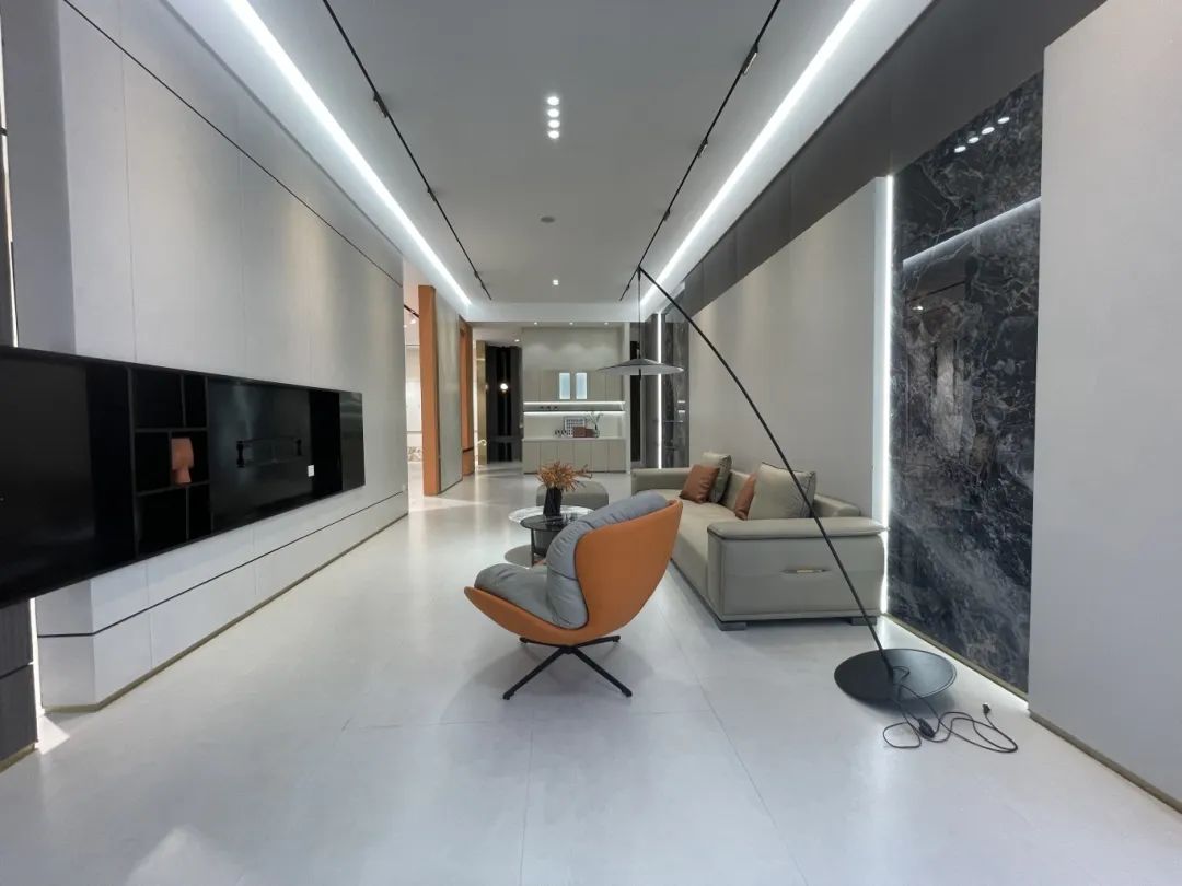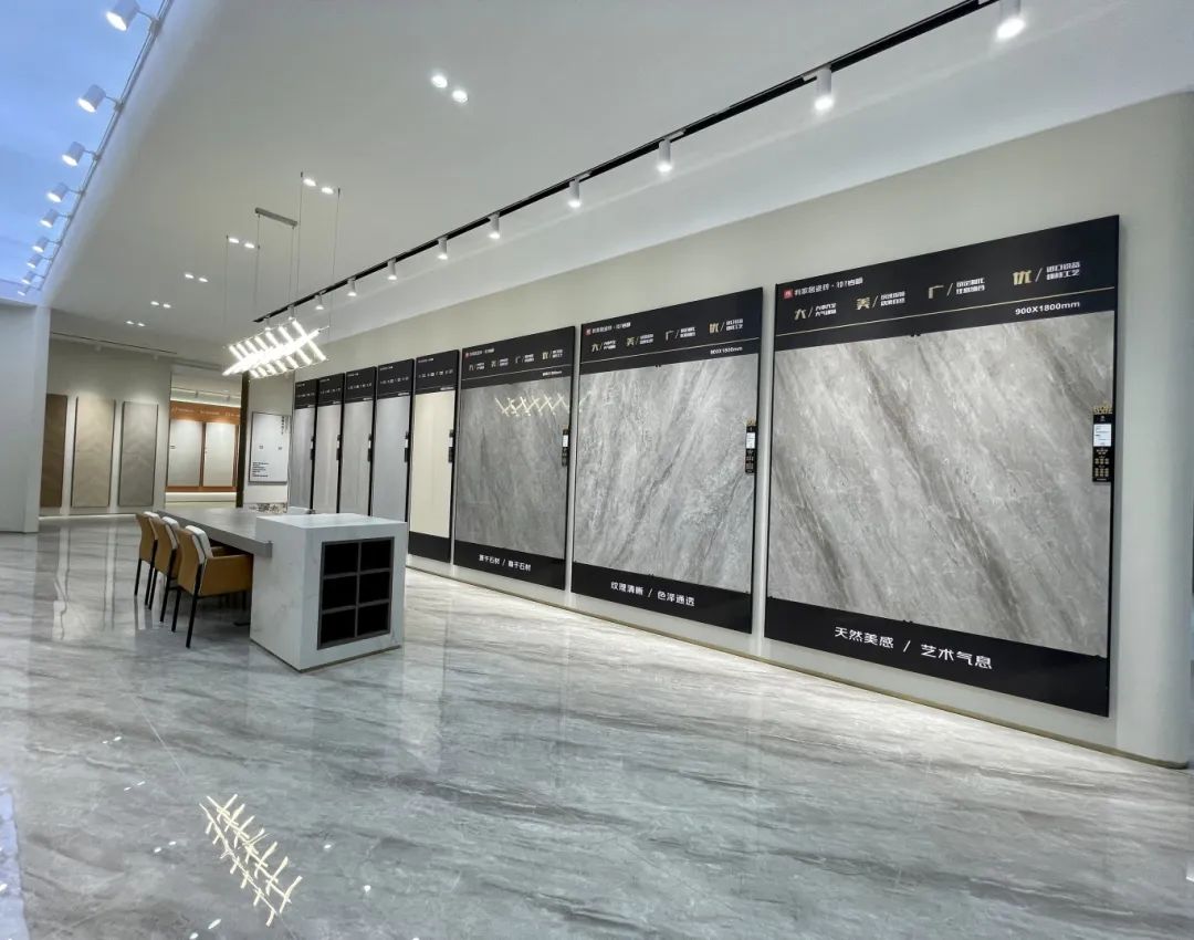 产品展示区布局简洁自然,分为大板、岩板、中板等规格的展示区。通过灯光辐射来营造温馨雅致的选材氛围,让空间生出由表及里的沉浸感。