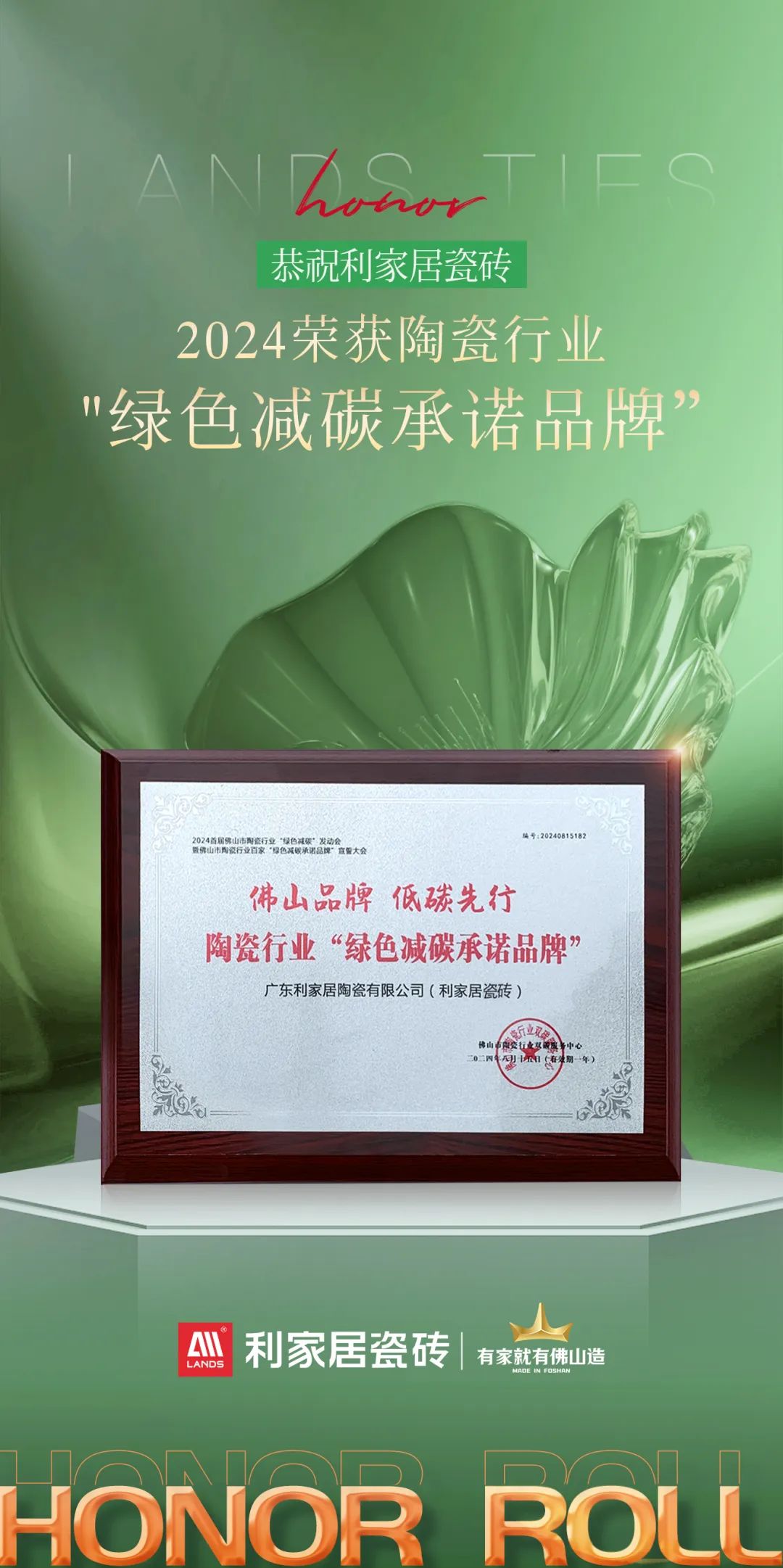 腾博tengbo9885官网瓷砖凭借卓越的产品质量、强大的品牌影响力以及绿色生产力,荣获陶业“绿色减碳承诺品牌”称号,树立行业减碳标杆,共同推动行业绿色转型和健康可持续发展。