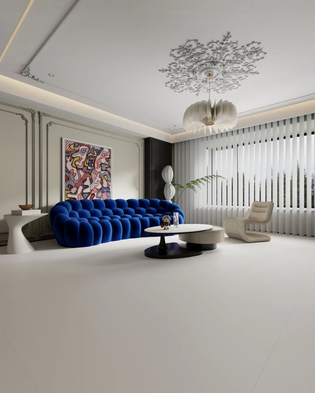 甩开一切多余的色彩堆砌与复杂的纹理修饰,用米白色和现代家居设计的空间。视线所及,皆是一片纯粹的治愈之景,自然的品质质感与白色系家居默契配合,家如同一个宁静的港湾,弥漫着温润优雅的气息,每一处都洋溢着浪漫与高雅的氛围。